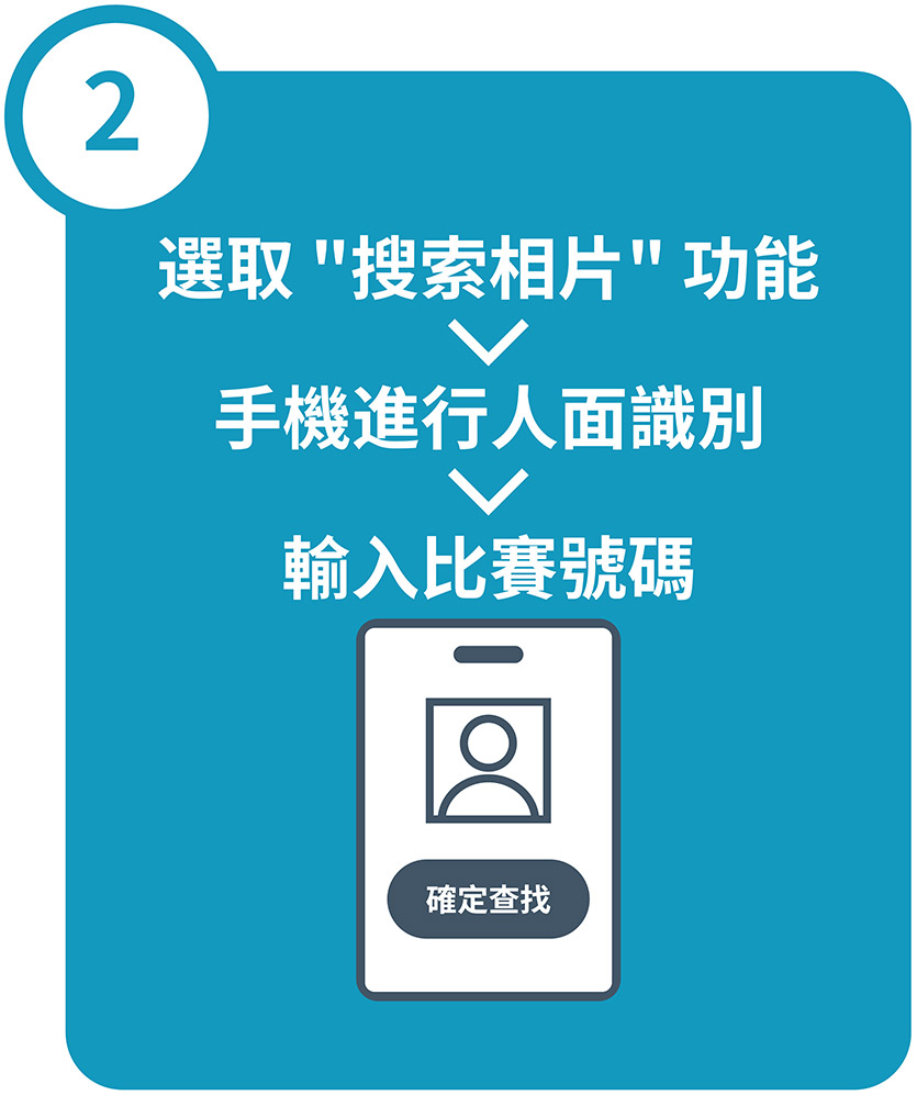 選取"搜索相片"功能 > 手機進行人面識別 > 輸入比賽號碼